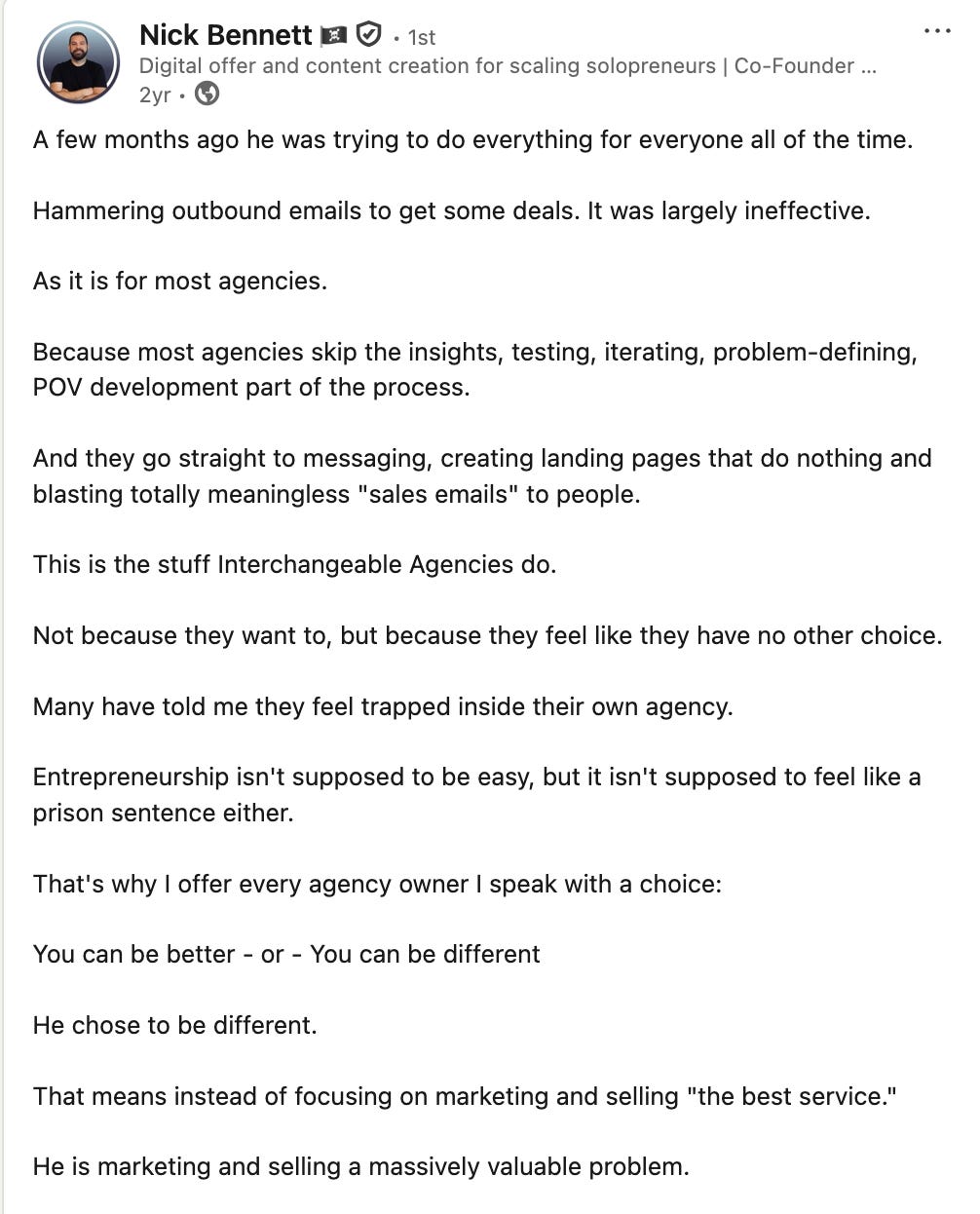 He reframed it as: “Leads are coming in, but they’re not sure what makes you different from the agency they just spoke to.”