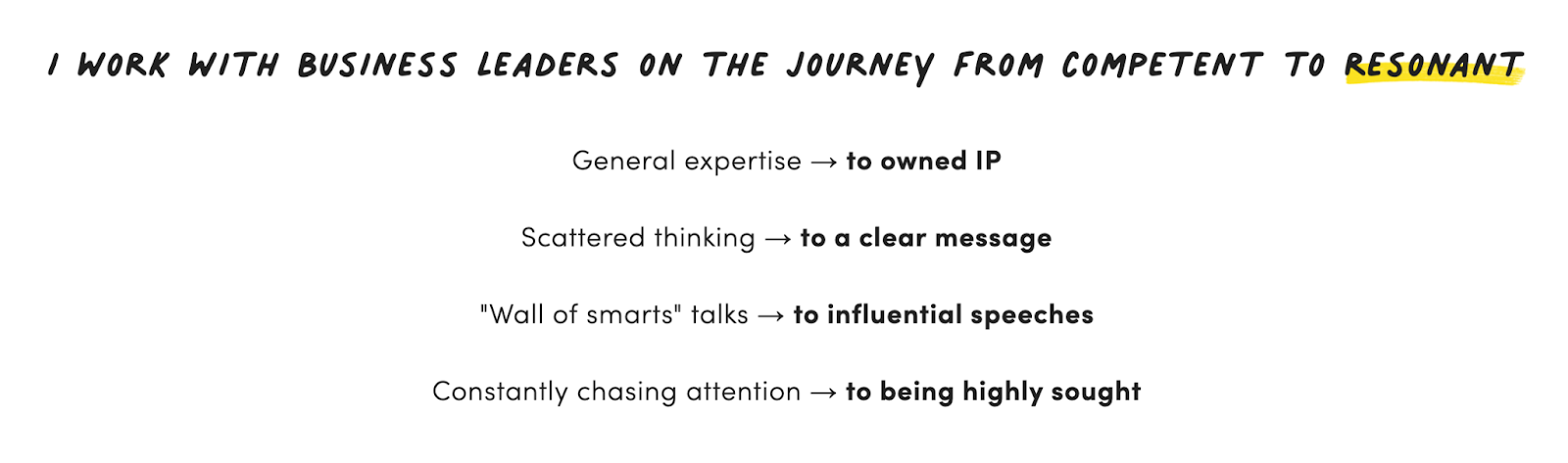 Our friend Jay Acunzo positions himself with this headline: “I work with experts and leaders on the journey from competent to resonant.”