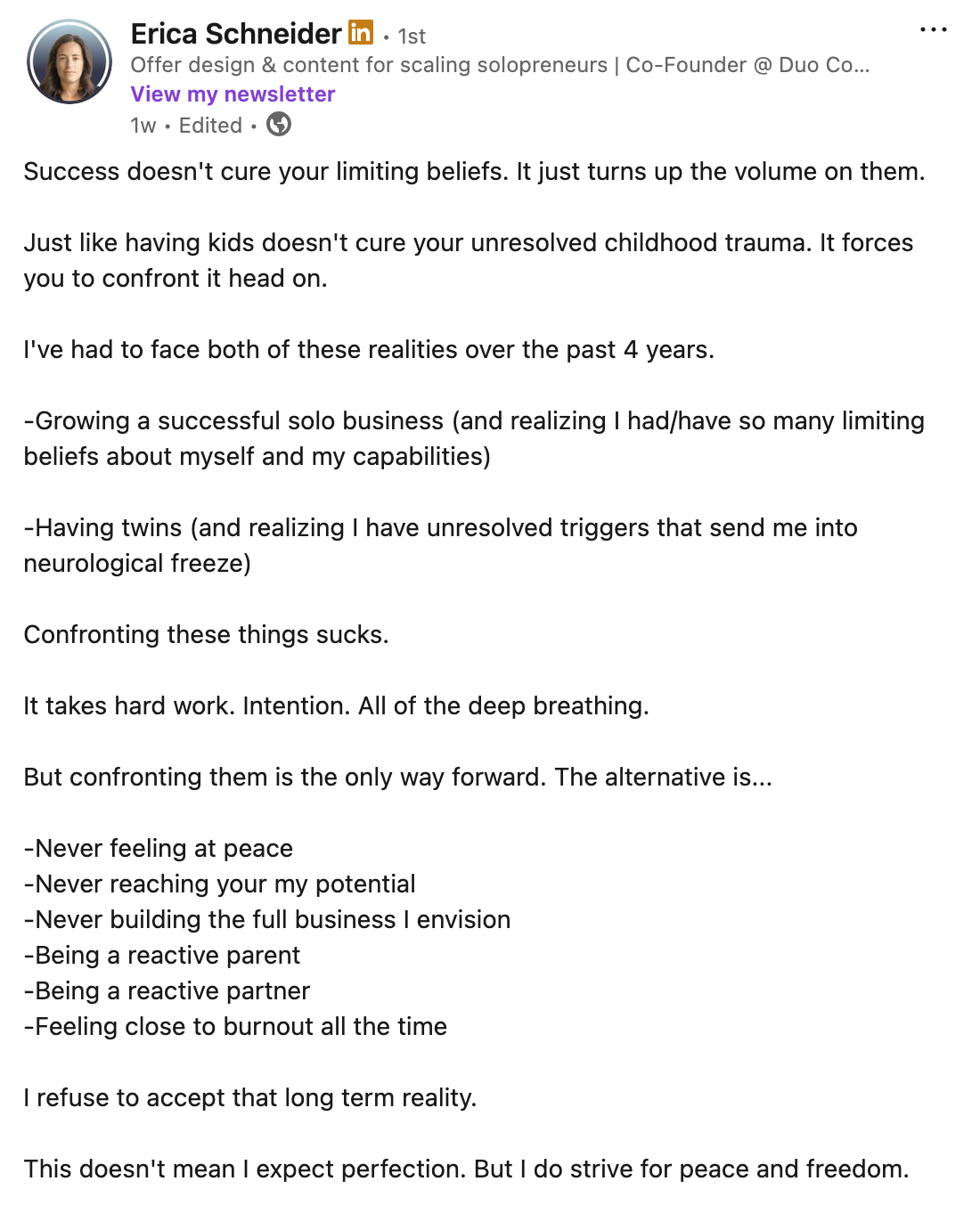 This is why some solopreneurs get glowing testimonials and still feel like frauds. Why you can hit revenue goals and still feel like you’re not doing enough. Why praise doesn’t actually make you feel better for more than a few hours.