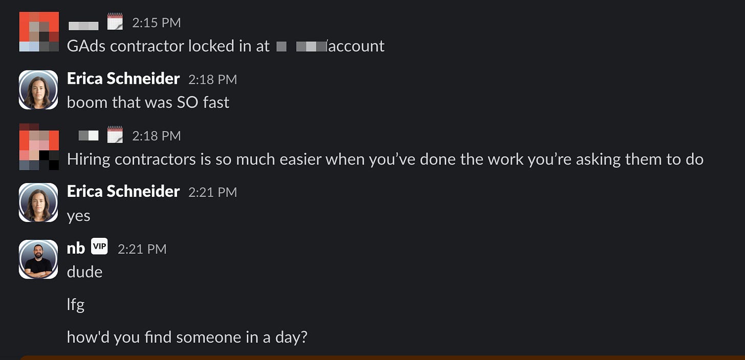To handle the influx, Brian hired three senior contractors, standardized his engagement model, and stopped doing all the delivery work himself. He freed himself up to focus on work that moved the business forward: strategy, business development, and marketing. Now, his contractors are building their own LinkedIn presence, and the business is compounding without Brian being the single point of everything.