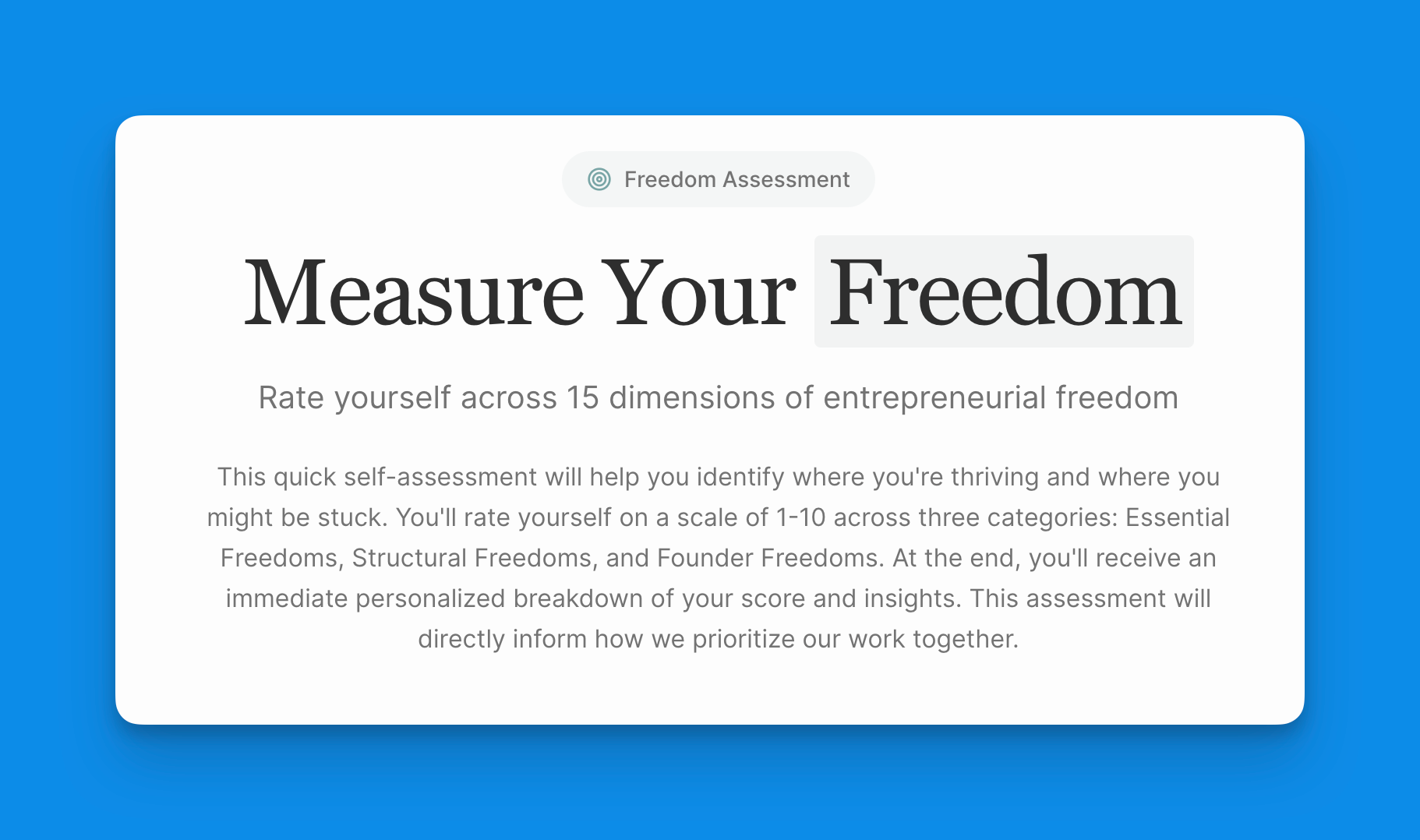 Figuring this out isn’t always straightforward. Most of our clients have never been asked these questions before, which is why we have every client take what we call a Freedom Assessment. It forces you to look at your business, often for the first time, and answer hard questions about what you’re building and why.